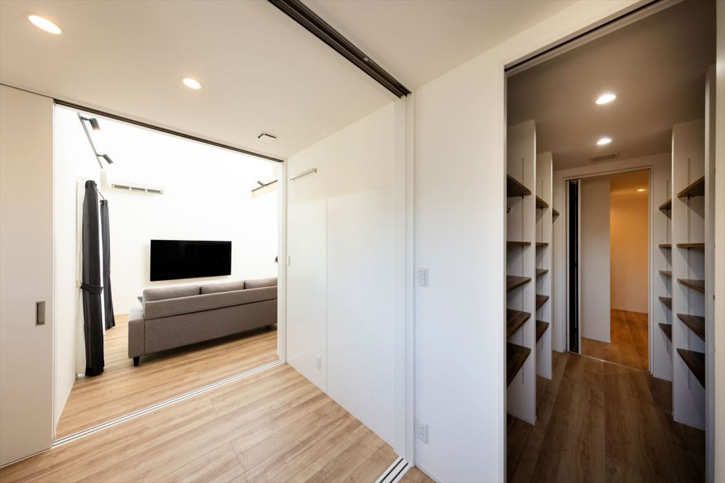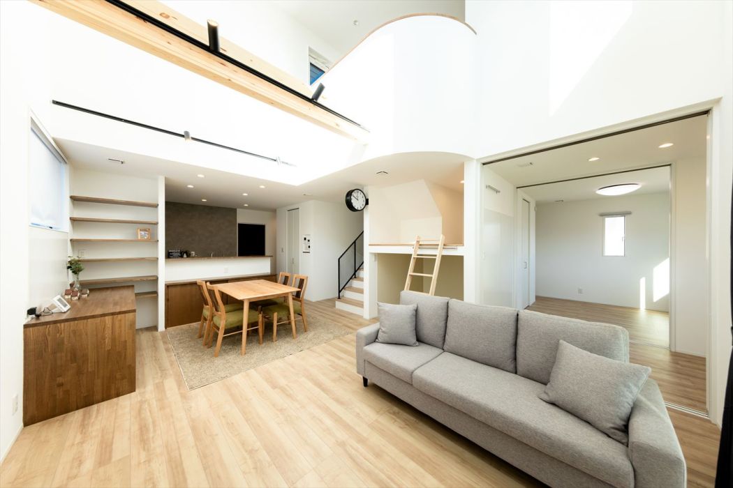 大容量の収納スペースは、はしごで登れるロフトのような遊び場付き。お子さまの秘密基地にもぴったりです。隣接する部屋は、扉をすべて開ければ広々とした一体空間としても利用可能。シーンに合わせて自由に使い方を変えられます。