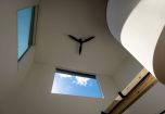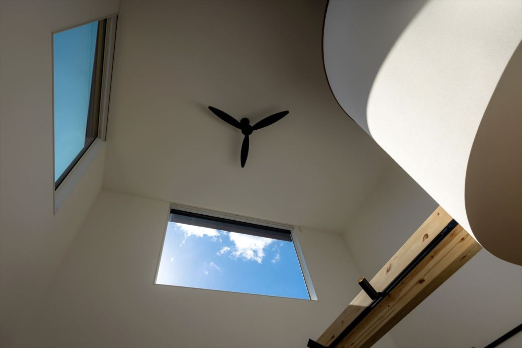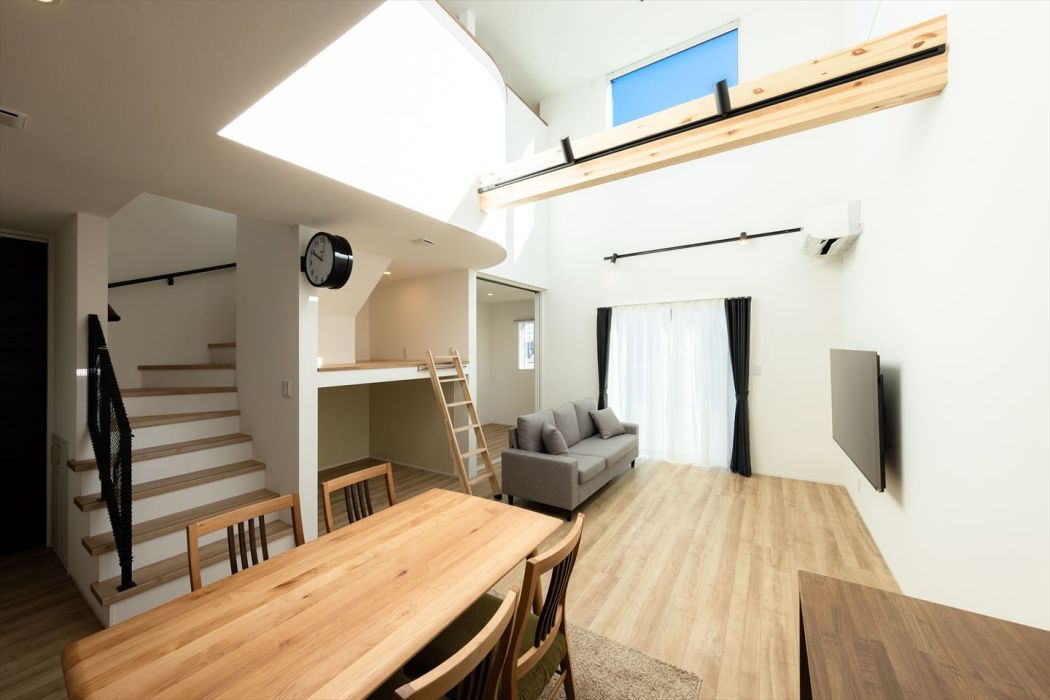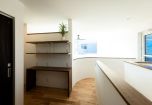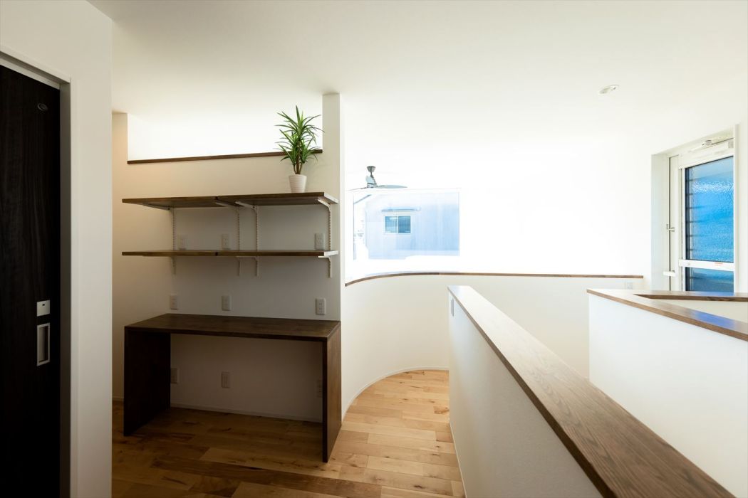 2階のエントランス部分には多目的に使えるデスクと棚を設置。やさしいアールの壁が、住まい全体に温かさとやわらかさを添えています。吹き抜け越しにリビングを見下ろせる設計で、家族の気配をいつも感じられる安心感のある空間です。さらに、吹き抜け上部の大きな窓からは、まるで絵画のような空の風景が楽しめます。