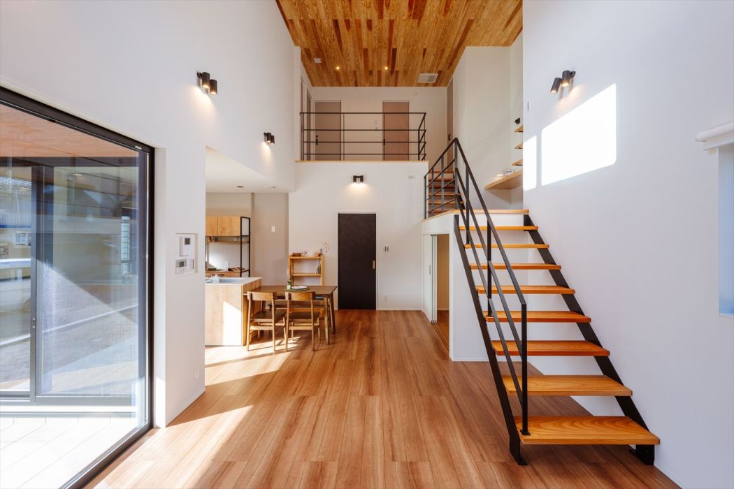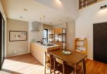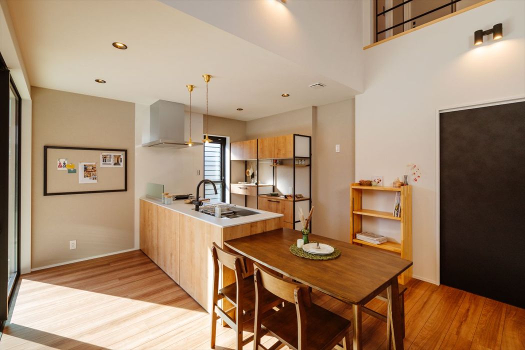 LDKは奥行き約9m・天井高5.4mの大空間が広がり、板張りの天井が無垢材の温もりを感じさせる癒しの空間を演出します。