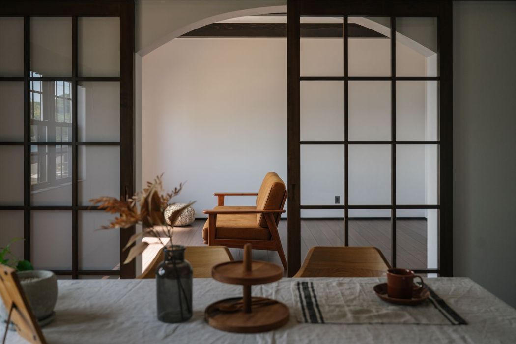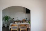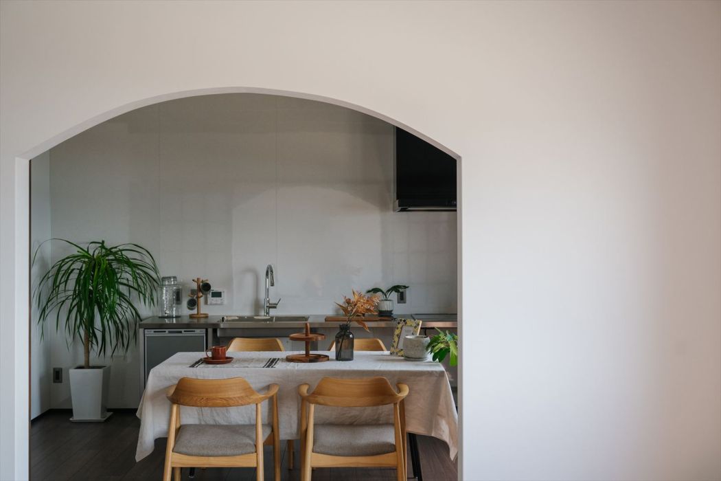 アーチ状の垂れ壁と木製の格子引き戸が、キッチンとリビングをゆるやかに仕切り、つながりを感じながらも、それぞれの居場所としての快適さをしっかりと確保。