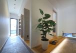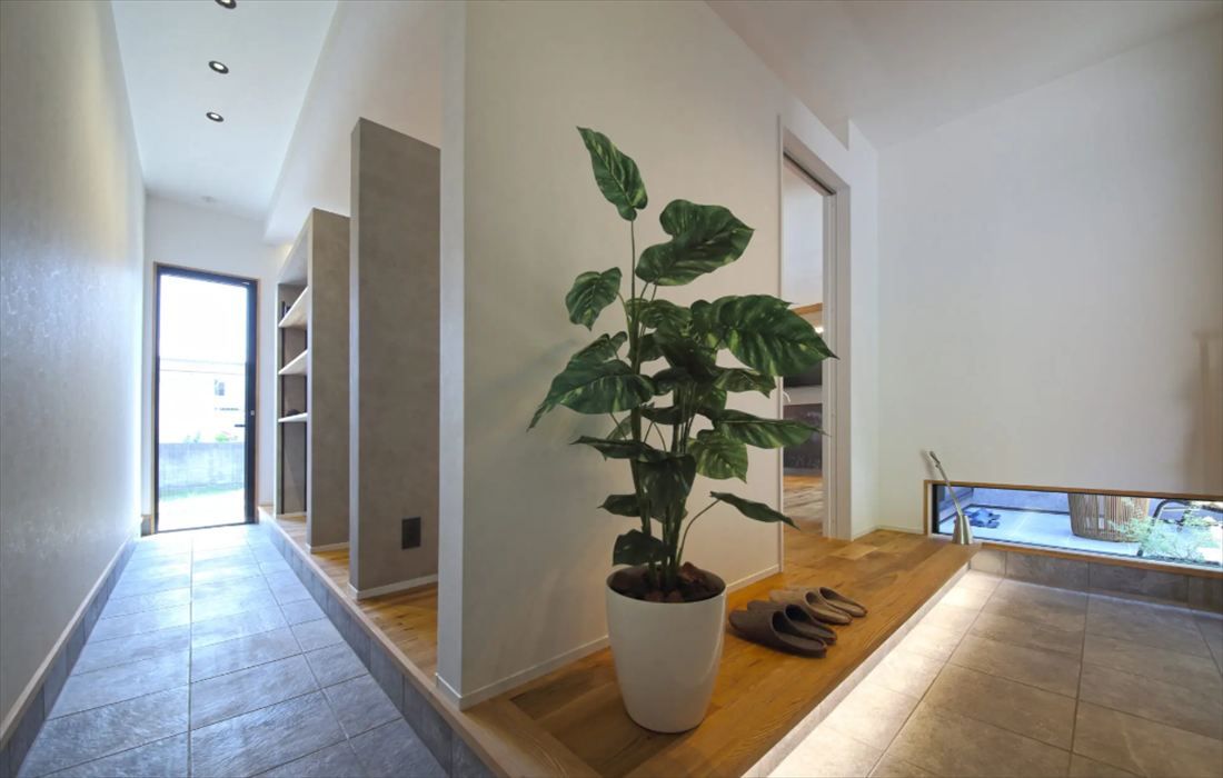 タイル張りの床に足元の間接照明がやわらかく光り、家族も訪れる人も気持ちよく迎えられる空間です。