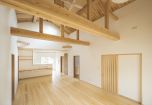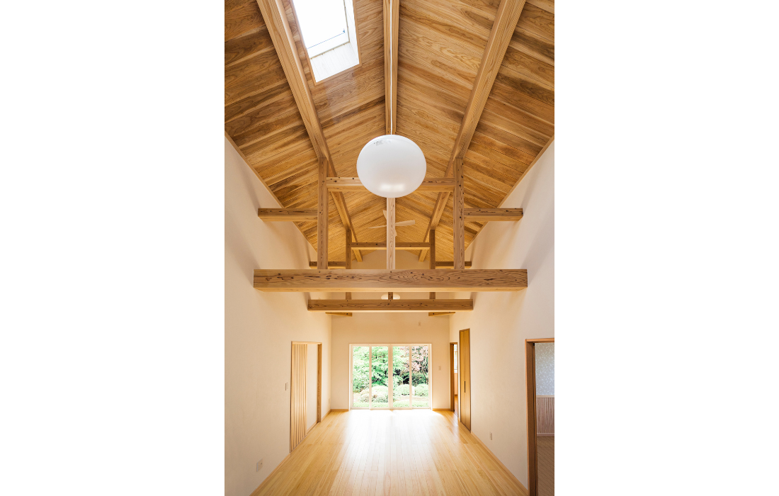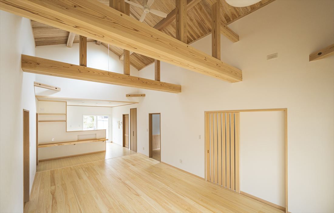 力強い木組みが印象的な吹き抜け空間は、木の香りに包まれた心地よい時間を演出します。